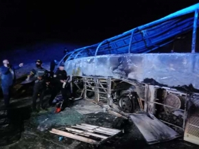 Húszan meghaltak, amikor a meghibásodás miatt az út szélén parkoló autóbuszba belecsapódott egy cementszállító teherautó.