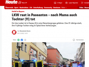 Egy kamionsofőr egy embercsoportba hajtott Passauban pénteken. Egy 37 éves nő meghalt, 11 éves lánya pedig a kórházban halt bele sérüléseibe -írja a Heute című osztrák napilap online kiadása. A terrorista szálat az első vizsgálatok kizárták.