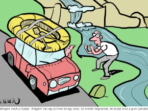 Heti rajzunk készítője Kelemen István, karikatúrájának címe: Raftingolni indult a család.