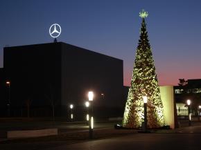 Harmadik alkalommal szervezett karácsonyi adománygyűjtést a kecskeméti Mercedes-Benz gyár. Az idei év különlegessége a gyár kapuja előtti 11 méter magas, 5,6 méter átmérőjű tűzifából összeállított fenyőfa volt.