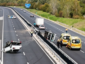 Egy üvegszállító autóval ütközött egy személygépkocsi az M6-os autópálya, országhatár felé vezető oldalán, Dunaújváros közelében.