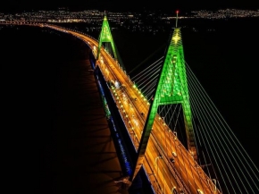 A híd ünnepi díszkivilágítása 2025-ben december 26-ig látható: zöldbe boruló pilonok, fények és csillagok teszik különlegessé az esti látképet.