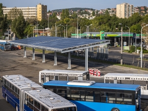 Két napelemes busztárolót adtak át a BKV kelenföldi buszgarázsában pénteken, a fejlesztésnek köszönhetően az elektromos buszok villamosenergia-szükségletének negyven százalékát a társaság önerőből fedezni tudja.
