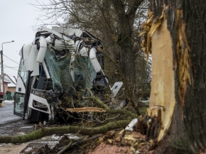 Fának ütközött menetrend szerinti autóbusz a Heves megyei Lőrinciben 2021. január 29-én. A balesetben hatan megsérültek. MTI/Komka Péter