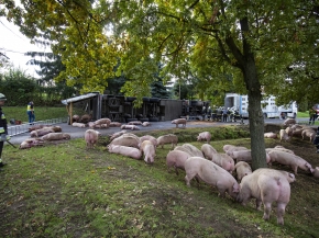 Tűzoltók egy felborult, sertéseket szállító kamion mentésén a Somogy megyei Böhönyén, a Szabadság utcában 2020. október 5-én. A jármű kétszáz állatot vitt, egy részük elpusztult vagy megsérült. MTI/Varga György
