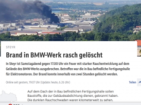 Steyrben erős füsttel járó tűz ütött ki a BMW gyár területén. A jelenleg építés alatt álló elektromos motorok gyártócsarnoka érintett. A tüzet két órán belül sikerült eloltani – írja az orf.at.