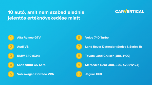 A carVertical autó előéleti nyilvántartó szakértői elemezték az autópiacot, és elkészítettek egy 10 autóból álló listát, melyek eladása nem tanácsos, jelentős értéknövekedésük miatt. A többezer előéleti jelentést tartalmazó carVertical adatbázist is felhasználták, hogy statisztikai adatokat kapjanak ezekről a modellekről. Íme a végső lista: