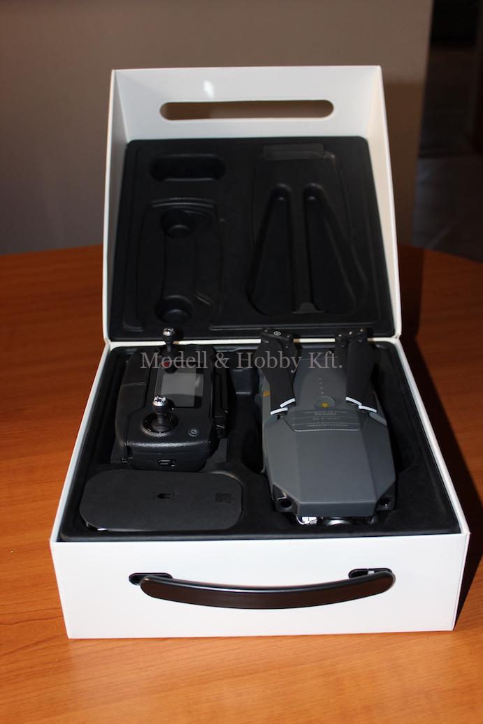 A drón így is érkezik, összecsukva üldögél a dobozában. Mellette találjuk meg a nem kicsit bonyolult, funkciógazdag, aktív hűtéssel, kijelzővel ellátott távirányítót, ami inkább egy miniszámítógép, mintsem egy hagyományos modell távirányító. A MAVIC PRO távirányítóval együtt érkezik, így a gyárban párosították már a drónhoz a távirányítót, ezzel tehát nem kell vesződnünk jelenleg.