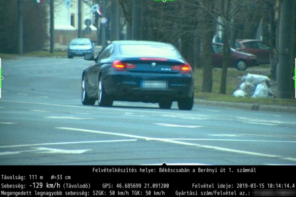 A közlekedési balesetek, a közúti tragédiák számának csökkentése érdekében a rendőrség Békés megyében is folyamatosan végez sebességellenőrzést. Az egyik készülékkel a rendőrök március 15-én délelőtt Békéscsaba belvárosában, a Berényi úton igyekeztek kiszűrni a forgalomból a szabálytalankodókat. Egy személygépkocsi vezetője a Szarvasi út felől a Kossuth tér irányába tartott úgy, hogy jelentősen túllépte a lakott területre érvényes sebességkorlátozást. A megengedett 50 km/óra helyett 129 km/óra sebességgel hajtott.
