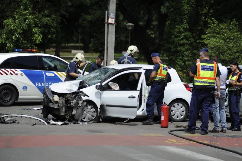 Helyszínelők dolgoznak június 29-én a XVII. kerületben, a Pesti út és a Bakancsos utca kereszteződésében, ahol balesetet okozott egy 16 éves fiú, aki előtte egy közlekedési nézeteltérésben fegyverrel fenyegette meg vitapartnerét. MTI Fotó: Mihádák Zoltán