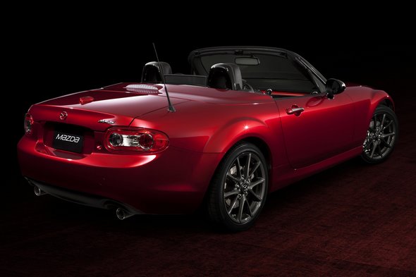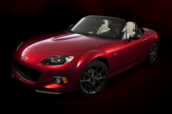A típus negyedszázados történetét most egy különleges, limitált szériával ünnepli meg a Mazda a ma kezdődött New York-i Autószalonon. A hivatalosan Mazda MX-5 25th Anniversary Edition névre keresztelt roadster fényezése vörös metál, de a tetőt, a tetőoszlopokat és a tükröket feketére fújták. Belül fehér bőrülésekkel és zongoralakk fekete betétekkel dobták föl a hangulatot a japán mérnökök, a 17 colos alufelnik sötét színűek.