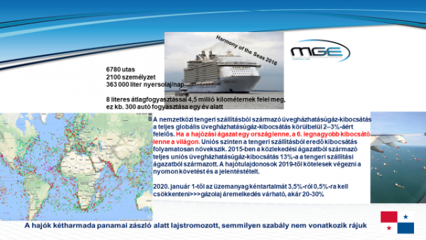 A járműiparnál vannak sokkal szennyezőbb területek is. Ilyen a légi forgalom és a tengeri hajózás. Példákat is mondott. Egy óceánjáró, amely 6780 utast szállít, 2100 fős személyzet szolgálja az utasokat, naponta 363 ezer liter gázolajat használ el. Nyolc literes átlagfogyasztással számolva ezt a mennyiséget 300 autó használja fel egy év alatt, ha 4,5 millió kilométert tesznek meg.