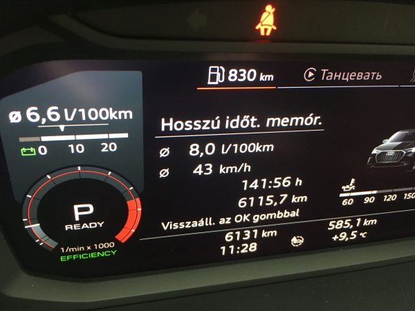 Sokat autóztam a Q7-tel, így volt alkalmam hosszabb távon is tesztelni a fogyasztását. Tele akkumulátorral indultunk kirándulni Baranyába, rendes tempóval, szabályosan közlekedve 38,2 kilométer alatt fogyott el a villanyáram. Ezalatt - 100 kilométerre vetítve - 32 kWh óra áramfogyasztást mutatott a fedélzeti számítógép. Az első 100 kilométeren 5,9 liter benzint és 13,7 kWh elektromos áramot fogyasztott az autó. A 200. kilométernél 8,1 literes benzinfogyasztást és 8,7 kWh áramfogyasztást, a 300. kilométernél ugyanez 8 literre és 6,5 kWh-ra, a 400. kilométernél 7,2 literre és 8,7 kilowattórára alakult (ha kétszer töltjük tele az akkut, 100 kilométerenként csak 2 liter benzinfogyasztással és 26,9 kWh átlagos áramfogyasztással számolhatunk, 200 kilométeren pedig 5,7 literes, illetve 14,8 kWh/100 kilométeres átlagot vehetünk, 300 kilométeren pedig 7 liter + 10,8 kWh az átlagfogyasztás). Akárhogy is számolom, ez alig nyolc literes átlagfogyasztásnak felel meg. Igaz, autópályán nem hajtottam (a nulláson azért belekóstoltunk a 200 feletti tempóba), állandóan ment a klíma és az ülésfűtés.
