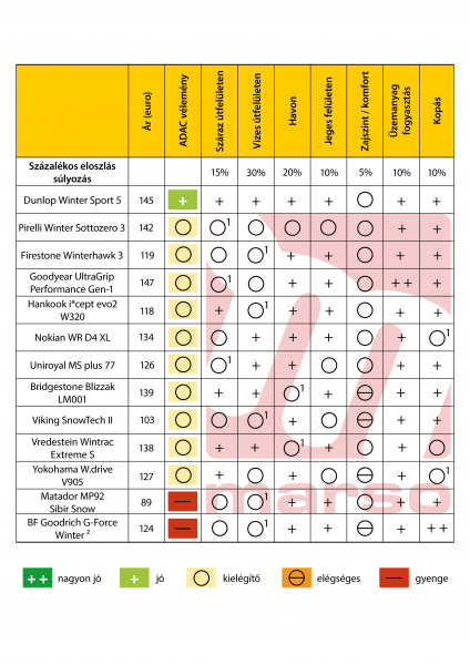 Az ADAC téli gumitesztjén 13 modell vett részt, de csak egy kapott az ADAC szerinti „jó” minősítést. Elsősorban a száraz utakon mutatott hiányosságok miatt került kizárásra az ADAC „jó” minősítésből a Pirelli Winter Sottozero 3, a Goddyear UltraGrip Performance és az Uniroyal MS plus 77. A Firestone Winterhawk 3, a Hankook i*cept evo2 W320 és a Viking SnowTech II pedig lényeges hiányosságokat mutatott vizes felületen. A kopásbeli tulajdonságok húzták le az ADAC minősítését a Nokian WR D4 és a Yokohama V905 W drive esetében. A Bridgestone Blizzak LM001 és a Vredestein Extreme S rosszabbul viselkedik havon, mint a versenytársai és ez a végeredményen is látszik.