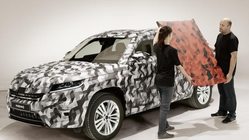 A Skoda ősszel érkező új szabadidő-autója a Tour de France-on szürke, fekete, fehér és piros színű álcázást kap, de a formája azért így is jól kivehető a hivatalos fotó alapján. Összesen 21 négyzetméter álcázófóliát használtak fel a kocsihoz, a 14 ezer kis lap felragasztása 4 dolgozónak 120 órájába került. A Kodiakot álca nélkül először szeptember 1-jén, egy berlini eseményen lehet majd megnézni, aztán pedig október 1-jén, a Párizsi Autószalonon.