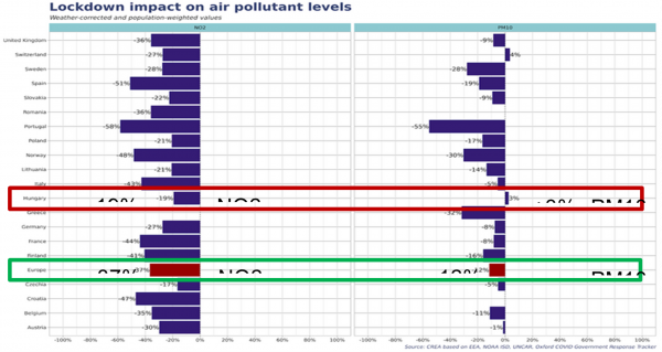 Magyarország földrajzi elhelyezkedése következtében a levegő tisztulásához erősen szeles-esős időjárás szükséges, amely képes kifújni, kimosni a légkörből a Kárpát-medencében megrekedt szennyezőanyagokat. A szél és az eső elmaradása esetén a kibocsátott káros anyag hosszú ideig megmarad országunk légterében. Ezért történhetett meg, hogy a tavaszi leállás alatt az időjárásra korrigált és a lakossággal súlyozott NO2-koncentráció hazánkban mindösszesen 19%-kal csökkent a leállás idején az előző évihez képest, míg az európai átlagcsökkenés ennek közel duplája, 37% volt. Megállapítható az is, hogy a PM10 koncentrációja ugyanezen időszakra vonatkozóan a Kárpát-medencebeli elhelyezkedés miatt Magyarországon 3%-kal nőtt, míg Európában visszaesett, átlagosan 12%-kal. Sajnálatos tény, hogy hiába csökkentjük rövid időre a kibocsátást, ha a táj, mint környezeti elem, megakadályozza a tisztulást. Amit kibocsátunk, az hosszú ideig velünk marad. Ezért lenne annyira fontos országunk számára az e-mobilitás, mert hosszú távon csak ez biztosítja a károsanyag-kibocsátás csökkentését.