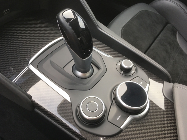 Mélyen ülünk a Giuliában, az indítógomb a kormányon, akár egy Ferrarin (vagy Audin), a váltókar csak sima joystick, nem ad visszajelzést, sportmódja nincs, szerencsére van nekünk dna-kapcsolónk, ha éppen mókázni akarunk. A nyolcfokozatú automata a ZF terméke, kiválóan kapcsol, szereti a kézi váltást is, a hatalmas alumínium váltófülekkel izgalmas ez a tevékenység. A dna-kapcsoló sportmódja, illetve külön is kapcsolható keményebb fokozata, egyben feszesebbé teszi a felfüggesztést is, ami így olyan kemény, hogy rossz úton büntet, de szerpentineken ez a vaj a kenyéren. A Veloce harapja a kanyarokat, ha valamivel szeretnék egyszer a Transalpinán autózni, akkor ezzel.