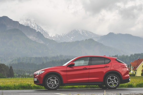 Precíz építészet, kastélyok, tökéletesre nyírt zöld fű, fenyőerdők, és a környező tavak gyönyörűen fodrozódó kék vízfelszíne. Szinte táncoltak a Stelvio művészien komponált vonalai a steril, már-már élére vasalt környezetben. Nincs szexibb a fél oldalra tolt rendszámtáblánál, a dupla kipufogóvégnél, vagy a kormányról való motorindításnál, a Stelvio szívdöglesztően stílusos. Azt mindig is tudtuk, hogy az olaszok értenek a formatervezéshez, de ekkora középkategóriás, közel 4,7 méteres SUV-nak még talán sosem rajzoltak ennyire kecsesen kupés farat. Lehetetlen volt nem szerelembe esni a gyönyörű vörös fényezéssel, és a 19-colos Classico felnikkel.
