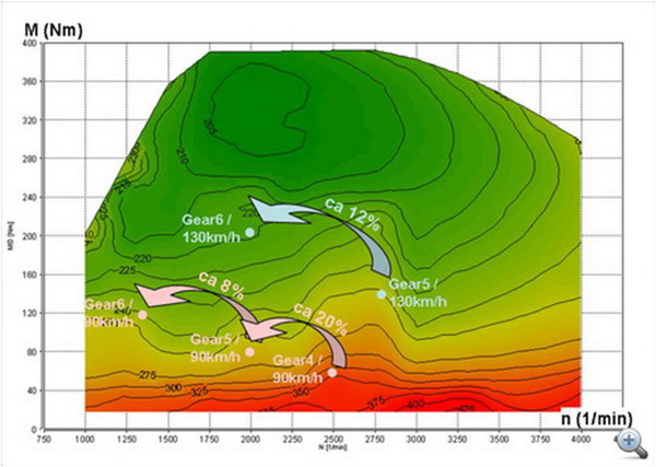 A diagramon azt látjuk, hogy 90-el haladhatunk úgy is, hogy a fajlagos fogyasztásunk 350 g/kWh, meg úgy is, hogy 240. A példa szerint majdnem a másfélszeresét etetjük meg a motorral, ha szükségtelenül alacsony sebességi fokzatban haladunk. Ha nincsen szükség gyorsításra, akkor a lehető leghamarabb váltsunk fel a lehető legmagasabb fokozatba. Semmi sem bosszant jobban ebben a témában, mint amikor a T***O parkolóban 3000-es fordulaton hosszasan parkolóhelyet keres valaki...
