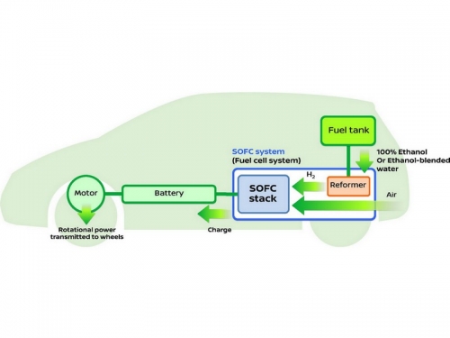 Az e-Bio üzemanyagcella SOFC áramforrása a jármű üzemanyagtartályában tárolt etanolból állít elő elektromos áramot. Az e-Bio üzemanyagcella azzal a hidrogénnel működik, amit a felhasznált üzemanyagból a levegő oxigénjének segítségével nyernek ki a gázreformálás eljárásával, és az itt bekövetkező elektrokémiai reakció szolgáltatja a jármű hajtásához szükséges áramot.