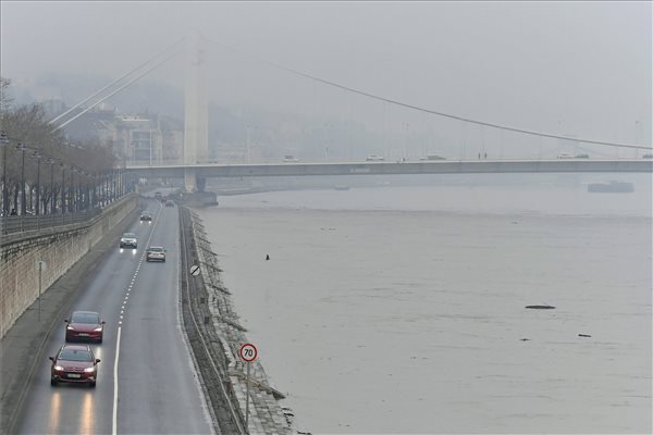 Autók haladnak a forgalom számára újra megnyitott Raoul Wallenberg rakparton a Dunán levonuló árhullám után Budapesten, az Erzsébet hídnál 2023. december 31-én. MTI/Lakatos Péter