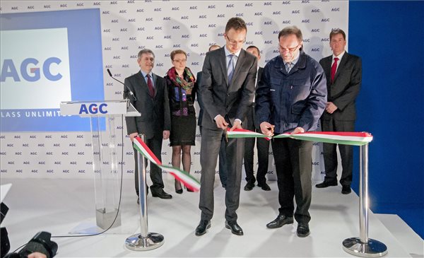 Szijjártó Péter külügyi és külgazdasági államtitkár (b) és Guy Lecocq, a japán ACG Glass európai gyártási igazgatója a nemzetiszínű szalag átvágásával átadja az autóüvegeket gyártó AGC Glass Hungary új üzemcsarnokát a tatabányai ipari parkban 2014. március 13-án. A 3,5 milliárd forintos beruházás az év végéig 140 új munkahelyet teremt.