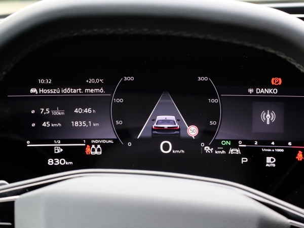 A tesztautóban volt adaptív tempomat kormányzással. Szépen működött, mint ahogyan a tavaly óta kötelező közlekedési tábla felismerés is, ami csipog, ha gyorsabban megyünk, mint amit az autó utoljára látott. Nyilván ennek a rendszernek a gyors és könnyű kikapcsolhatóságát minden gyártó megoldja valahogyan. Az Audiban a kormányon lévő csillaggal jelölt gombra lehet felprogramozni ezt a funkciót, amit a lelkes kollégák korábban már megtettek helyettem, köszönet érte.