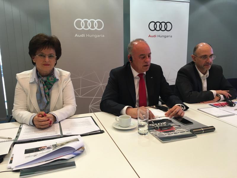 Az Audi AG sajtótájékoztatója után hagyományos sor került az Audi Hungaria Zrt. beszámolójára, amelyen Peter Kössler, az ügyvezetés elnöke, Axel Schifferer pénzügyekért és Knáb Erzsébet személyügyekért felelős ügyvezető igazgató vett részt.