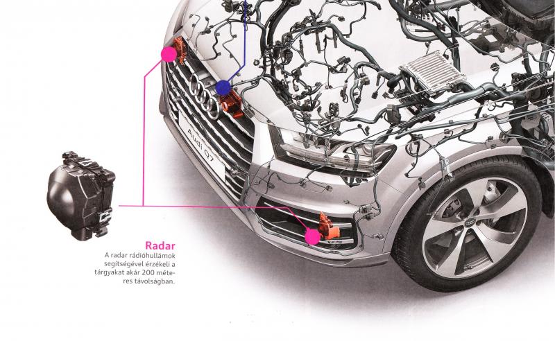 Kezdjük a radarokkal. Az első radarok (kettő van belőle) 200 m-es hatótávolsággal bírnak, velük tárgyak ismerhetőek fel. Jeleit a torlódásasszisztens és a prediktív hatékonyságasszisztens használja.