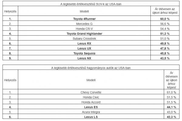 Mivel Amerika az SUV-k és a platós kisteherautók birodalma, ezért a legértékállóbb kocsik a Toyota szabadidő-autói, hiszen strapabírók és megbízhatók: a Tacoma, Tundra és 4Runner az első négyben szerepel. Egyedül a Chevy Corvette férkőzött be a második helyre (ami annak tudható be, hogy az ikonikus amerikai modell minden korosztály szívéhez közel áll, azaz használtan is jól eladható). Ez a négy autó tudott csak legalább 60%-os értéktartást elérni ötévnyi használat után. Ennél fogva a SUV-ok kategóriáját a 4Runner vezeti, de a Top10-be befért még a Toyota Grand Highlander, Sequoia, a Lexustól pedig az RX, NX és az UX is. Ami a hagyományos személyautókat illeti, a Lexus vitézkedett az ES-szel és a zászlóshajó LS-szel. Utóbbi már csak azért is jól tartja az árát, mert hamarosan leáll a gyártása, s így az utánpótlás megszűnésével a használtpiacon is egyre ritkább lesz a modell.