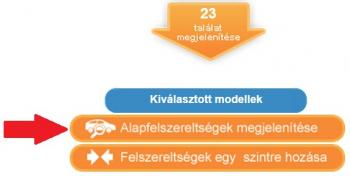 Erre klikkelve, a képernyőn lévő mindegyik kocsi „dobozában”, megjelenik az alapfelszereltsége (tehát az, ami benne van az alapárban).