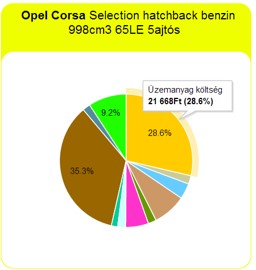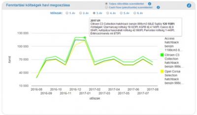 Ezek után további pár perc alatt eljuthatunk az eredményrészhez, ahol élvezetes diagramokon keresztül ismerhetjük meg a kiválasztott autók fenntartási költségeit és a költségek összetételét, illetve időbeni alakulását.