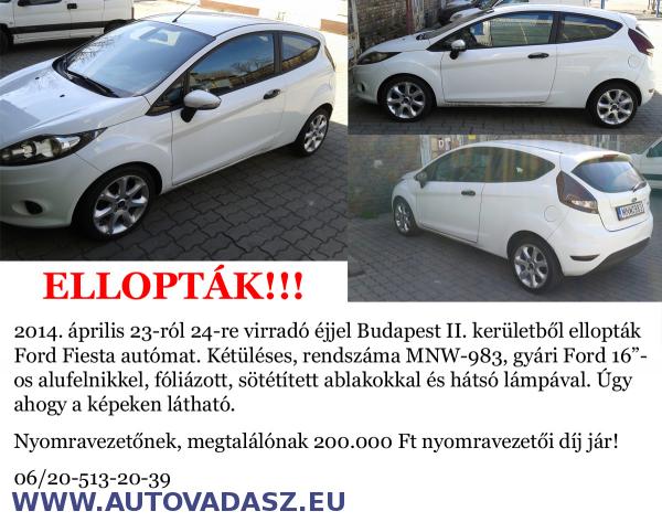 2014. április 23-ról 24-re virradó éjjel Budapest II. kerületből ellopták Ford Fiesta autómat. Kétüléses, rendszáma MNW-983, gyári Ford 16”- os alufelnikkel, fóliázott, sötétített ablakokkal és hátsó lámpával. Úgy ahogy a képeken látható. Bal oldali ajtó közepén egy hosszanti 10-12 cm-es karcolás található. Nyomravezetőnek, megtalálónak 200.000 Ft nyomravezetői díj jár!