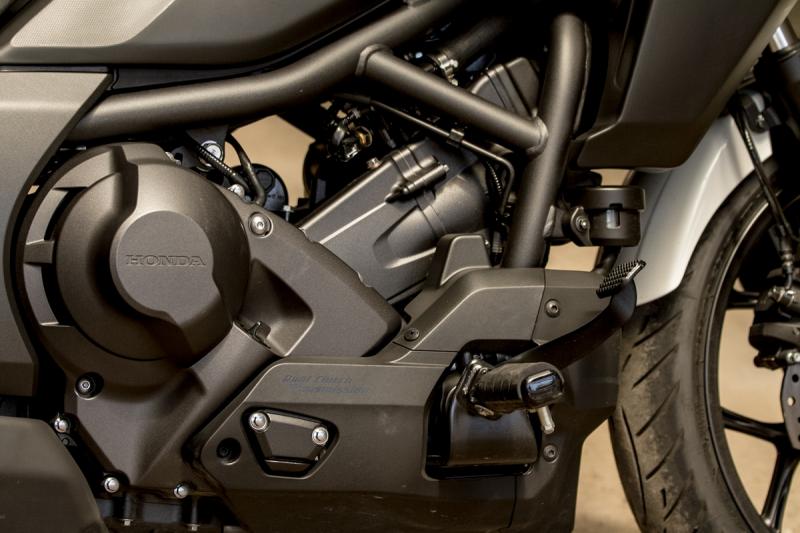 A másik pedig a motor-váltó egység. A kéthengeresben gyakorlatilag semmi érdekes nincs, hacsak a korábban említett viselkedést nem tekintjük annak. Nem csavarták fel túlságosan a teljesítményét, hiszen a 6250-es fordulaton jelentkező 48 lóerőnél lényegesen többet is ki lehet facsarni ekkora hengerűrtartalomból. Nem véletlen ez, hiszen így A2-es jogosítvánnyal is vezethető, ami egy újabb kör előtt nyitja meg az utat a CTX felé, akár kezdő motorosok járgánya is lehet. Akik talán éppen robogóról szállnak fel egy komolyabb teljesítményű járműre. Így nekik kedvezhet a duplakuplungos automata is – becsületes hondás nevén DCT –, ami ugyanakkor óriási előrelépés a CVT-váltókhoz képest. Hat fokozattal gazdálkodhatunk, amit az automatika a körülményeknek megfelelően kapcsolgat. Indítás után nincs más dolgunk, csak sebességbe lökni, és már indulhatunk is – természetesen nem elfeledve a rögzítőfék oldását. Még a szokásos csattanás sem marad el, amikor egyesbe tesszük.