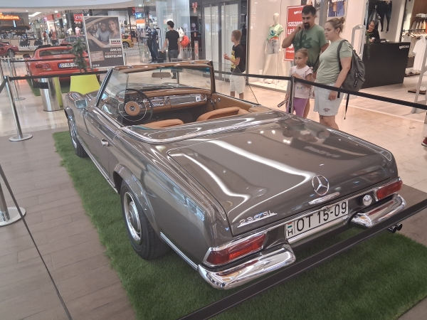 Az Árkádban kiállított, kereken 60 éves, 1300 kilogramm saját tömegű Mercedes-Benz W113-ast egy 2,3 literes, 150 lóerős motorral szerelték. A Franciaországból hozott autó 18 éve van Magyarországon, sokat nem gurult, a 2012-es kilométeróra állás 66 650, a 2024-es 75 428.