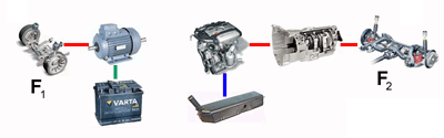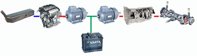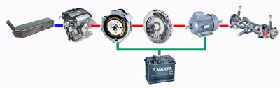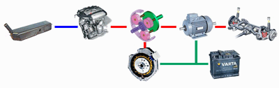 Teljesítményelágazásos rendszer: nincs benne sebességváltó, mert a bolygómű és a villamos gépek fokozatmentes sebességváltóként működnek. A hibrid rendszerek alkotóelemei külön-külön általában ismertek, mint például a fennti villamos motor, de a villamos gépekben új vonások mutakoznak. Legjellegzetesebb újdonság a lendítőkerék "villamosítása". Eddig is jellegzetes alkatrésze volt a (mechanikus) tengelykapcsolónak, most pedig tekercsek (és néha állandó mágnesek) beépítésével olyan villamos gép lett belőle, amely áramot tud termelni (generátorként), illetve áram bevezetésére motorként tud működni (akár a belsőégésű motor indítómotorjaként, akár vonóerő kifetése céljából). A látókörünk szélesítése érdekében nézzünk meg néhány fotót néhány videót és három előadás anyagát: 1 - 2 - 3 * Dr. Emőd István - Tölgyesi Zoltán - Zöldy Máté: Alternatív hajtások. Maróti Könyvkiadó, 2006. 234 p. |