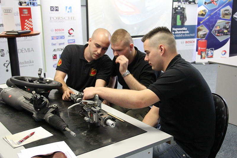 A verseny neheze csak ezután következett: a tanulóknak a POHU oktatóközpont műhelyeiben kellett a gyakorlati munkában is jeleskedniük, három gyakorlati feladatot kell megoldaniuk: vezérlés beállítás, kétkuplungos automatikus nyomatékváltók, dízelmotoros autó diagnosztikája.. Valamennyi VW, Audi szerkezetet dokumentáció birtokában kellett mérni, szerelni, beállítani.