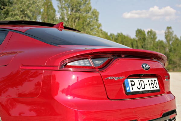 E tekintetben a motorháztetőn lévő beömlők kivételek. A tigrisorr és az első lámpák sportos, de nem tudatmódosító ábrázatot kölcsönöznek szemből, a hátsó fénytestek különleges formája és oldalirányú benyúlásai pedig kifejezetten kreatív módon emelik ki a tömegből a Stingert. Ez utóbbi részletek világos (kontrasztosabb) szín esetén látványosak igazán.