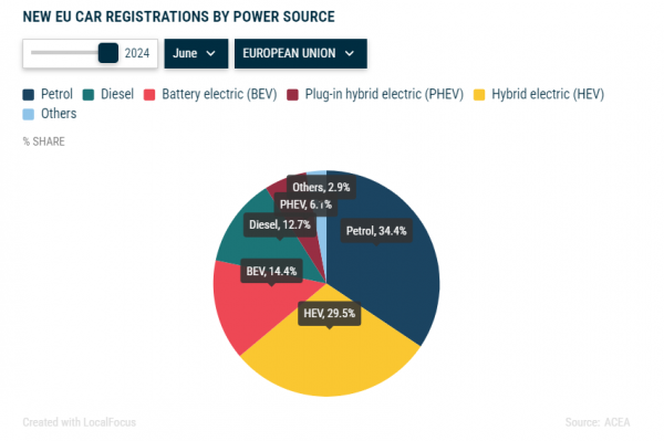 Júniusban a benzines és dízeles autók együttvéve a teljes autópiac 47,1 százalékát tették ki – 34,4 % benzines, 12,7% dízeles -, ami csökkenést jelent a tavalyi 49,6 százalékos részesedéshez képest. A második legnagyobb a hibrid-elektromos (PHEV) személygépkocsik szegmense volt, ezek az autók tették ki a teljes autópiac 29,5 százalékát, míg tavaly júniusban ennél kisebb, 24,4 százalék volt a részesedésük. Elgondonkoldató az is, hogy eközben a tisztán elektromos (BEV) autók piaci részesedése 15,1-ről 14,4 százalékra csökkent. A tölthető hibridek (PHEV) csupán 6,1 százalékot hasítottak ki az autópiaci tortából júniusban.