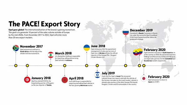 Az átfogó exportoffenzíva fontos pillére az Opel/Vauxhall PACE! stratégiai tervének. A következő évtized közepére az Opel értékesítési volumenének több, mint tíz százalékát kívánja Európán kívül értékesíteni. Ennek elérése érdekében a márka erősíti jelenlétét Ázsiában, Afrikában és Dél-Amerikában, ahol már eddig is képviseltette magát, de 2022-ig további húsz piacot nyit meg. A legfrissebb példák a visszatérés Oroszországba, vagy a belépés Kolumbiába, Ecuadorba.
