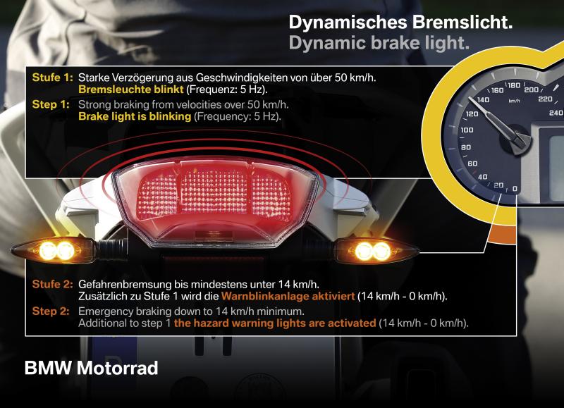 Legfrissebb szakmai hír, hogy a BMW motorkerékpárjain is alkalmazni fogja. Plusz tudománya, ha lassú a haladás, megállás közeli a tempó, amiről fékeznek, akkor a villogás mellett a vészvillogót is bekapcsolják.