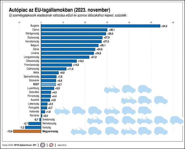 Az ACEA adatai szerint Magyarországon az idei első 11 hónapban 99 743 új autót helyeztek forgalomba, 3,7 százalékkal kevesebbet az egy évvel korábbi 103 523-nál. Ezen belül 24,1 százalékkal több, 5375 BEV-autót, 14,4 százalékkal több, 5123 PHEV-autót, 6,9 százalékkal több, 41 148 HEV-autó, 15,5 százalékkal kevesebb, 35 553 benzines, és 10 százalékkal kevesebb, 12 019 dízeles autót helyeztek forgalomba.
