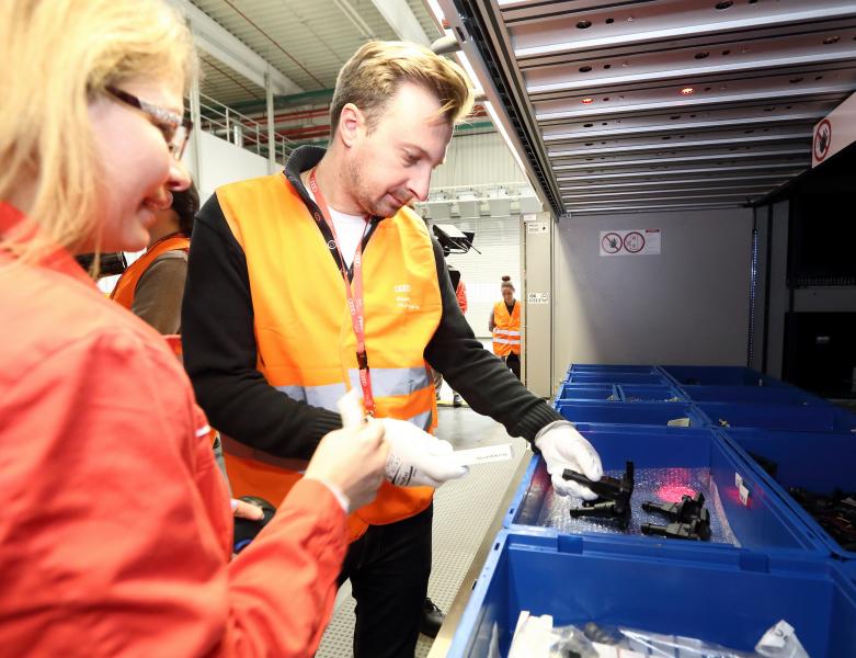 Itt éppen a V8-V10-es motorokhoz gyűjti kosárba az alkatrészeket a kolléga egy csinos audis logisztikus segítségével.
