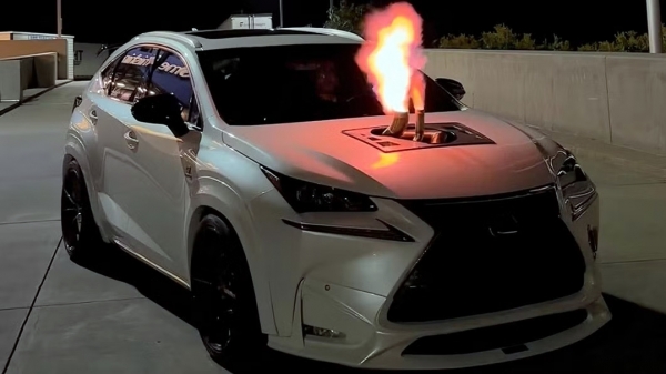 Talán ugyanez vezérelte, amikor a fehér NX200t majdnem teljes kipufogórendszerét eltávolította. A motorból induló leömlő a munka során szó szerint felömlővé változott, és a géptetőt átfúrva az ég felé mered. A megfelelő fordulatszámon lángokat okádó Lexus arra is bizonyíték, hogy a motor eredeti vezérlése is megváltozott, hiszen egy, az emissziós előírásokat biztosan teljesítő Lexus-motor önszántából biztosan nem köpne lángokat. Az üzemanyagban túl dús keverékre utaló durrogás és a lángok arra utalhatnak, hogy a katalizátor már nem az autóban lakik. A kipufogó pedig akkor okádhat tüzet, ha a távozó gázokban lévő benzinfelesleg a szabadban lévő oxigénnel találkozva berobban.