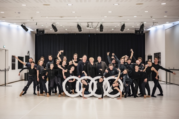 Közös fotó az első próba után: A kép közepén balról jobbra: Kiss János, a Magyar Művészeti Akadémia alelnöke, a Győri Balett korábbi igazgatója, Németh Kinga, az Audi Hungaria személyügyért és szervezetért felelős igazgatósági tagja és Velekei László, a Győri Balett igazgatója a Győri Balett táncművészeivel
