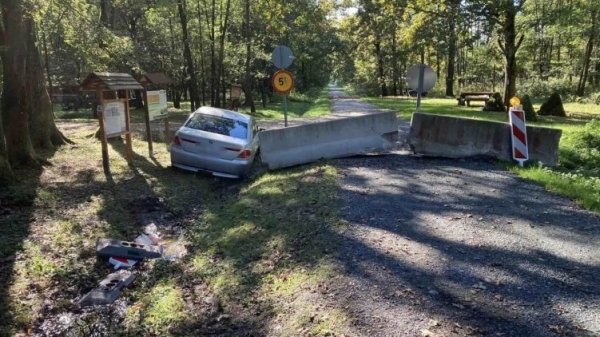 A köves útról letérve a vízelvezető árkon keresztül próbáltak átjutni, úgy, hogy a közúti jelzőtáblák talpait az árokba fektették, majd miután a felázott talajon elakadtak, a jelzőtáblát is a kerekek alá helyezték, de így sem tudtak kijutni a kocsival.