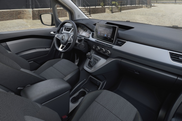 Modern műszerfalat kapott a Kangoo, a tablet-szerű érintőképernyőt szépen integrálták a középkonzol tetejére, kényelmesnek tűnik a nagy könyöklő, rengeteg a tárolórekesz, a váltót magasra hozták, hogy kézre álljon. Az új háromküllős kormánykerék mögött hagyományos, analóg műszerfalat találunk, a hátul lefalazott áruszállító verziókban megjelent a digitális középső tükör, amely nagyon megkönnyítheti a tolatást.