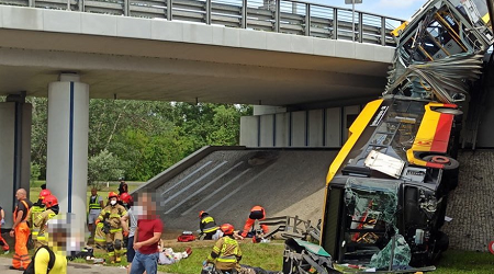 A varsói tömegközlekedési vállalat egyik autóbuszának csütörtöki balesetében egy asszony meghalt, négyen súlyosan megsérültek. A csuklós busz, amelyen a baleset pillanatában mintegy negyvenen utaztak, egy elágazásban áttörte a felüljáró védőkorlátját és kettészakadt: az elülső rész az odalent haladó Visztula parti főút kerékpárútjára zuhant, míg hátsó része fennakadt a korláton.