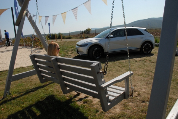 A teszt végén még belefért egy kávé, amit a Hyundai iOniq töltőcsatlakozójába, most éppen konnektorába dugva főztek, és amit a vállalkozóbbak hintaágyban fogyaszthattak el. Beültem, mert annyival is tovább csodálhattam a dunakanyari panorámát, és az összképet, benne a környzetet egyáltalán nem zavaró elektromos Hyundait, ami katasztrófa helyzetben, péládul viharos felsővezeték szakadáskor akár egy háztartást is képes árammal ellátni.
