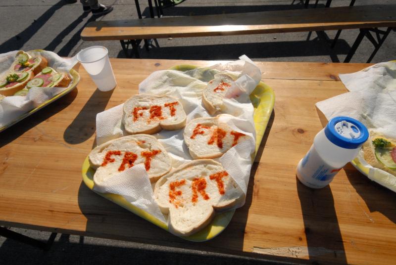 A jó hangulatról a rendező BME csapata gondoskodott: bérelte a pályát, gardírozta a meghívottakat, mindenkit étellel és itallal kínált. Nem ötcsillagos, hanem csillagos ötös volt a szerviz: a tálcákon zsíros kenyér, stílszerűen mindegyiken FRT felírat, ami piros aranyos ízesítés mellett a műszaki egyetemisták Formula Racing Team nevére utalt.